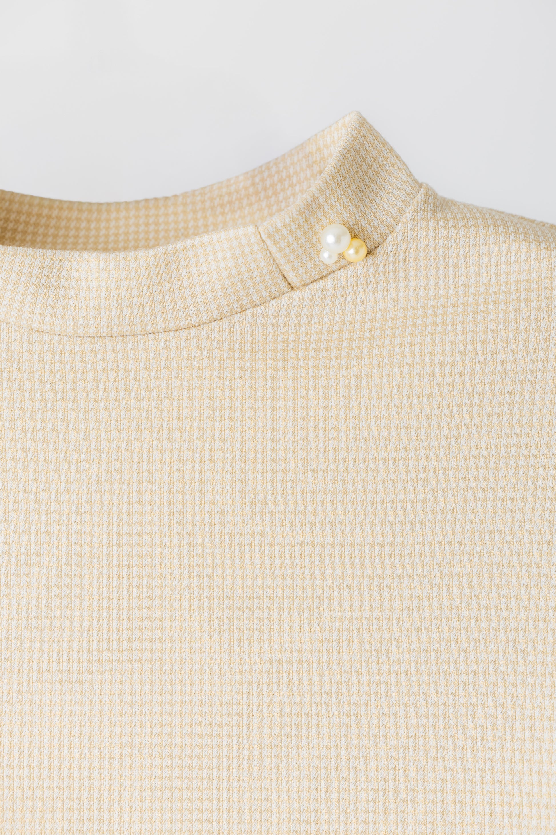 低めのモックネックはスリット入りで着やすさ抜群、パールのポイントがついています。