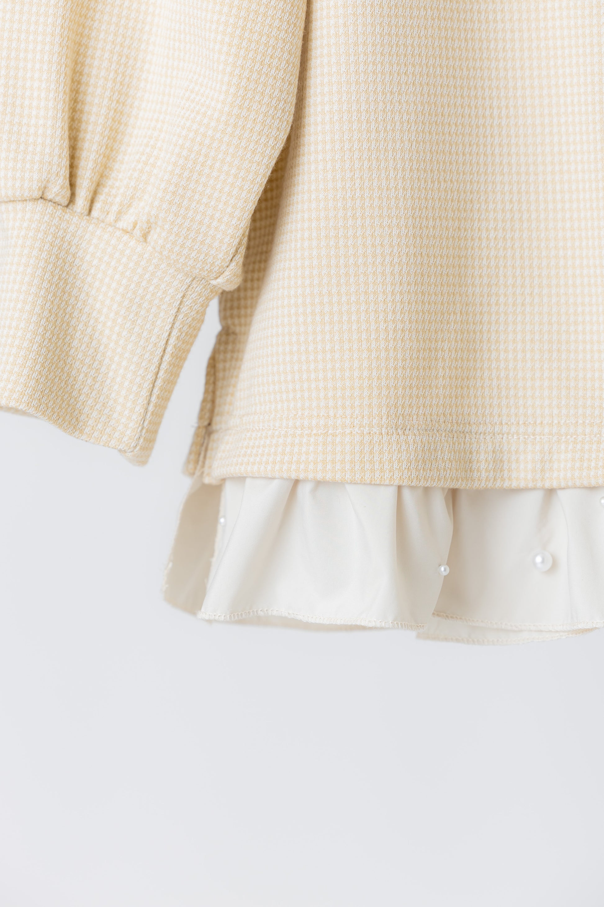 パールのついたフリルが裾のアクセントになりお腹周りも気にならない。